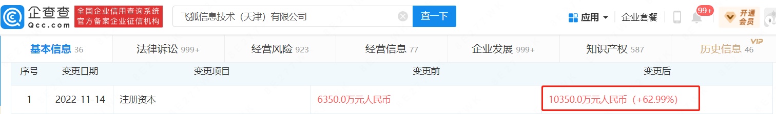 智通财经APP获悉,企查查APP显示,近日,搜狐视频关联公司飞狐信息技术(天津)有限公司发生工商变更,注册资本由6350万人民币增至约1亿人民币,增幅约63%。