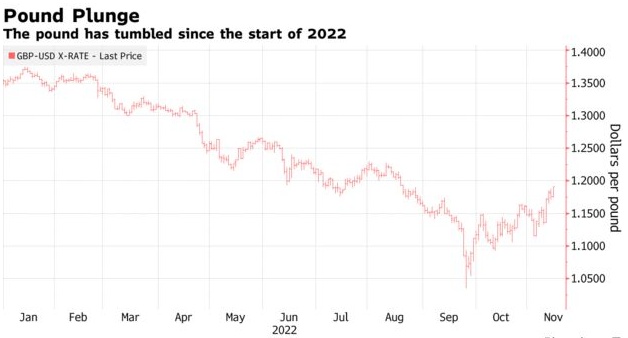 今年英镑兑美元大幅下跌,在9月份时任首相特拉斯的“迷你预算”出台后,英镑兑美元跌至历史最低点,该预算包括大量无资金支持的减税。