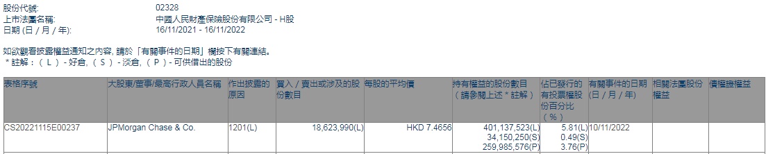 智通财经APP获悉,香港联交所最新资料显示,11月10日,小摩减持中国财险(02328)1862.4万股,每股作价7.4656港元,总金额约为1.39亿港元。增持后最新持股数目约为4.01亿股,最新持股比例为5.81%。