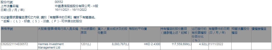 智通财经APP获悉,香港联交所最新资料显示,11月11日,Hermes Investment Management Ltd减持中国通信服务(00552)809.38万股,每股作价2.43港元,总金额约为1966.79万港元。减持后最新持股数目约为1.18亿股,最新持股比例为4.92%。