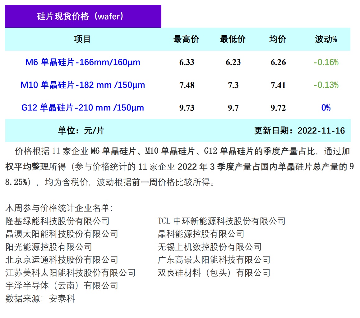 mm /150μm)价格区间在7.3-7.48元/片,成交均价降至7.41元/片,周环比跌幅为0.13%;G12单晶硅片(210