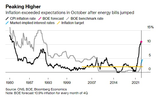 智通财经APP获悉,英国通胀率增长超过预期,达到11.1%的41年高点,再次增加了英国央行的加息压力。在电力和天然气价格上涨后,能源价格随之上涨,较贫穷的家庭正受到较大的影响。消费者价格指数(CPI)增幅高于央行预期的10.9%,也高于经济学家预测的中值10.7%。英国国家统计局本周三表示,食品和能源价格推动了物价上涨。