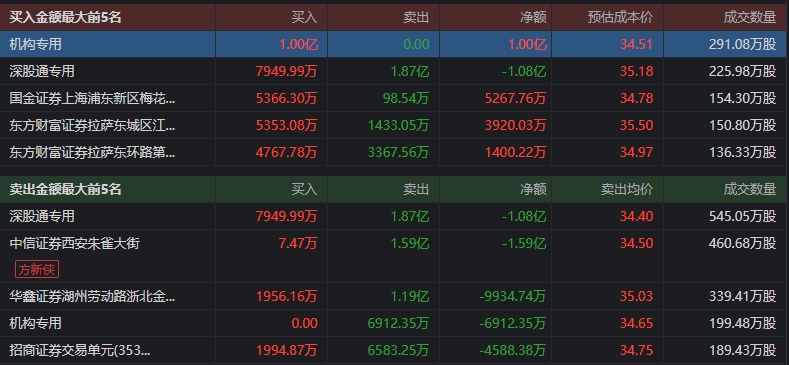 机构专用席位上,一机构净买入1亿元,一机构净卖出6912.35万元,合计净买入3132.24万元。