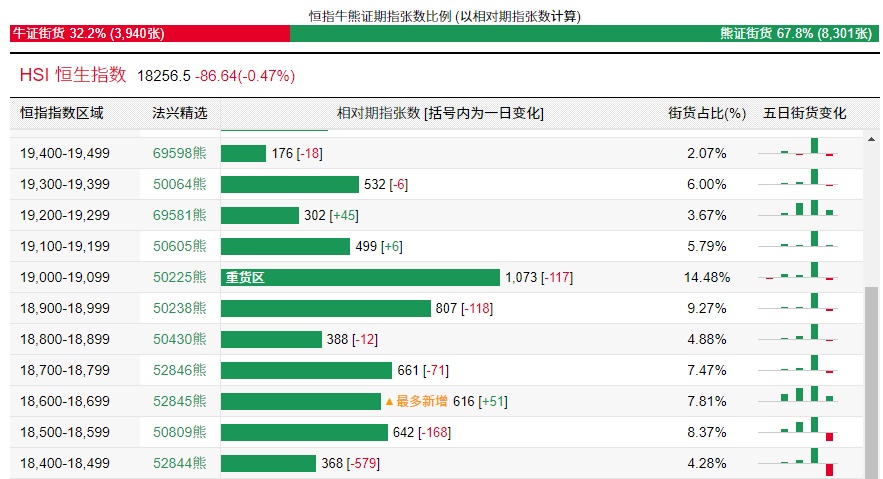 法兴恒指牛熊证街货分布图中的数据显示,熊证街货重货区在19000-19099区间,该区间最新熊证数量为1073张,较上一交易日减少117张;最多新增在18600-18699区间,该区间最新熊证数量为616张,较上一交易日增加51张。