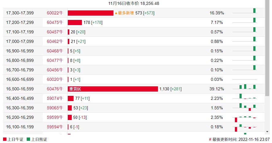 牛证街货重货区在16500-16599区间,该区间最新牛证数量为1130张,较上一交易日增加281张;最多新增在17300-17399区间,该区间最新牛证数量为573张,较上一交易日增加573张。