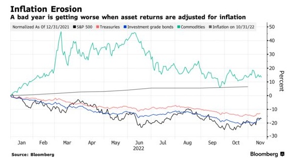 数据显示,除大宗商品外,所有主要资产——从股票、美国国债到公司债券——经通胀调整后的跌幅今年都超过了18%。