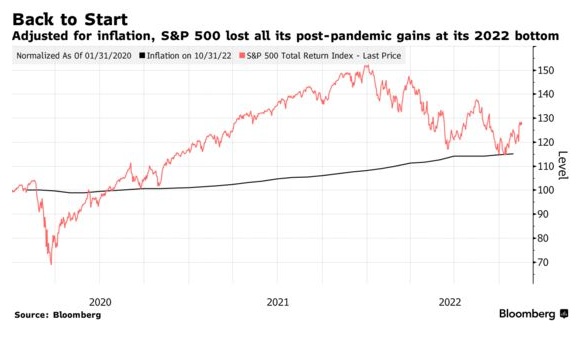 在去年10月创下的今年最差水平上,标准普尔500指数仍比新冠危机前创下的峰值高出6%。然而,如果考虑到通货膨胀,新冠疫情后的所有收益都化为乌有。