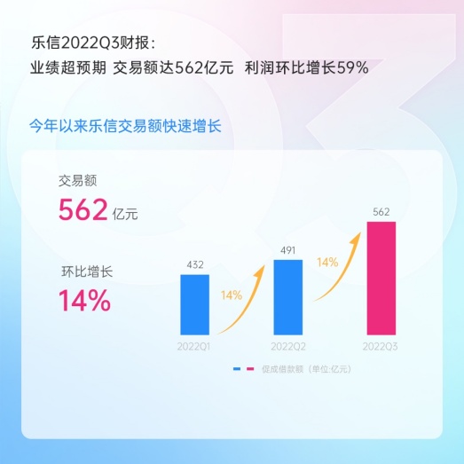 智通财经APP获悉,北京时间11月17日,中国领先的新消费数字科技服务商乐信(LX.US)发布2022年三季度未经审计财务业绩:在国内疫情多点散发、经济复苏承压背景下,取得超预期的业绩增长,交易额达到562亿元(人民币,下同),超出此前530亿的预期,环比增长14%;在贷余额946亿元,环比上升9%;营收27亿元,环比增长12%;利润(Non-GAAP