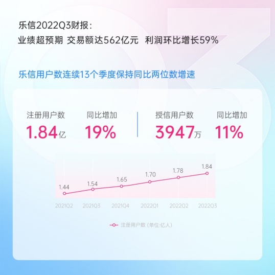 截至三季度末,乐信用户数达1.84亿,同比增长19%,连续13个季度保持同比两位数增速;授信用户数3947万,同比增长11%。