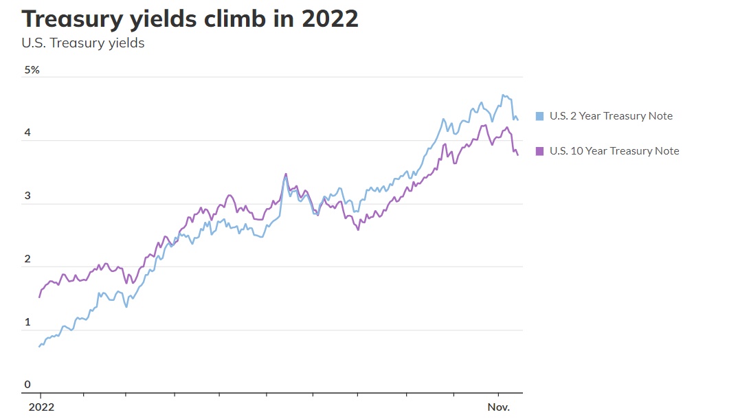根据上周公布的美国消费者价格指数(CPI)数据,10月份通胀放缓的迹象导致美国国债收益率下降。投资者开始消化美联储在12月将加息幅度降至50个基点的可能性,同时市场对于明年利率见顶的时间、区间(由5%以上降至4.75%-5%)和高利率持续时间也有所降温。