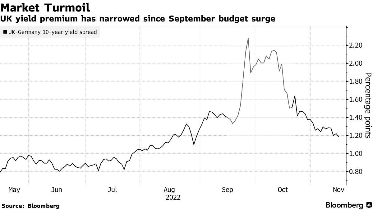 自9月份英国国债暴跌以来,国债收益率溢价已经收窄