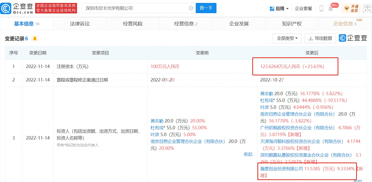 智通财经APP获悉,企查查APP显示,近日,深圳市尼卡光学有限公司(下称:尼卡光学)发生工商变更,新增股东瀚星创业投资有限公司