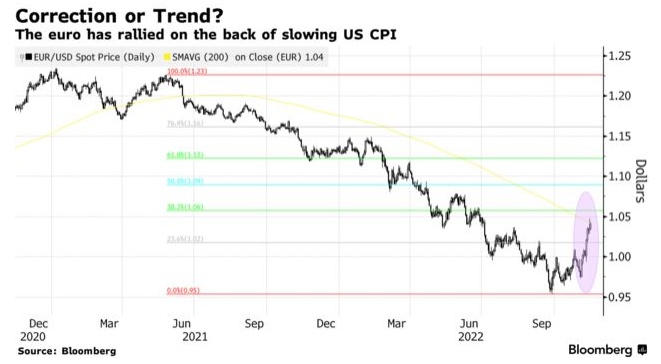 在美国通胀降温的迹象出现后,美元出现大规模抛售,得益于此,欧元兑美元本月已飙升5%,达到7月以来的最高水平。但是,瑞银全球财富管理公司、罗素投资公司和Insight Investment都表示,欧元是否能自行进一步走强尚存疑问。