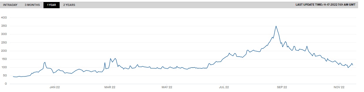 数据显示,在异常温暖气候,以及较高天然气存储量的支撑之下,欧洲天然气价格基准——TTF天然气价格已经下降至今年以来的低点附近。在周三收于113.9欧元/兆瓦时。