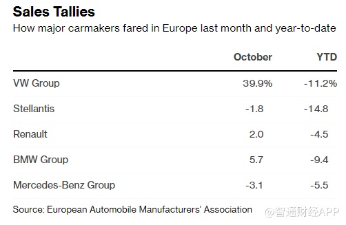 大众汽车10月表现突出,销量同比上涨40%,宝马销量上涨近6%。