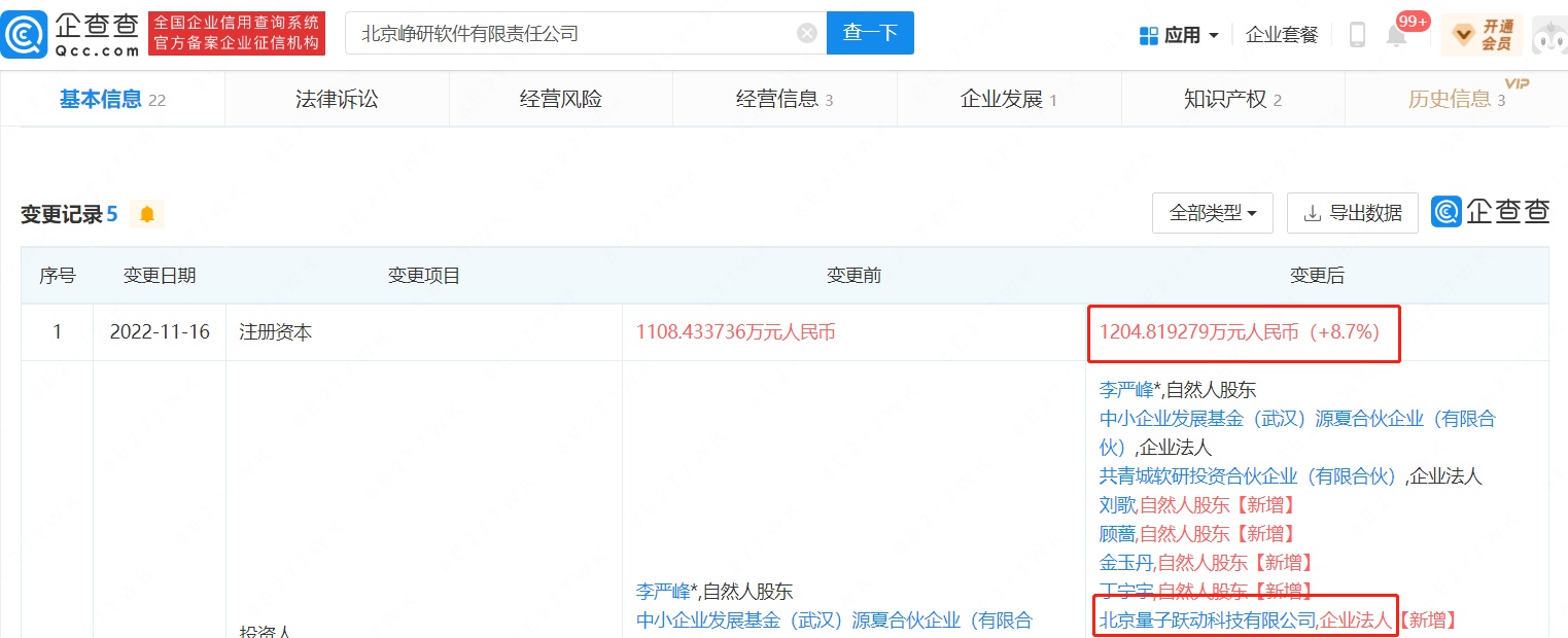 智通财经APP获悉,企查查APP显示,近日,北京峥研软件有限责任公司(下称:峥研软件)发生工商变更,新增抖音旗下北京量子跃动科技有限公司为股东,持股比例为2.5%;同时公司注册资本由约1108.43万人民币增至约1204.82万人民币。