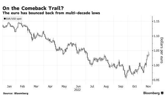 德银策略师Alan Ruskin和George Saravelos认为,即使地缘政治环境没有发生重大变化,欧元也有可能升至这一水平,前提是美国当局在明年下半年错误地倾向于货币宽松政策,而欧洲央行仍在提高借贷成本。欧元目前的交易价格在1.0380美元左右,比去年9月下旬的最低点高出8%以上。“如果实现了这一点,即使没有地缘政治的变化,这种政策分歧也被视为确保欧元兑美元汇率在2023年底前至少回升至1.10的充分条件。”