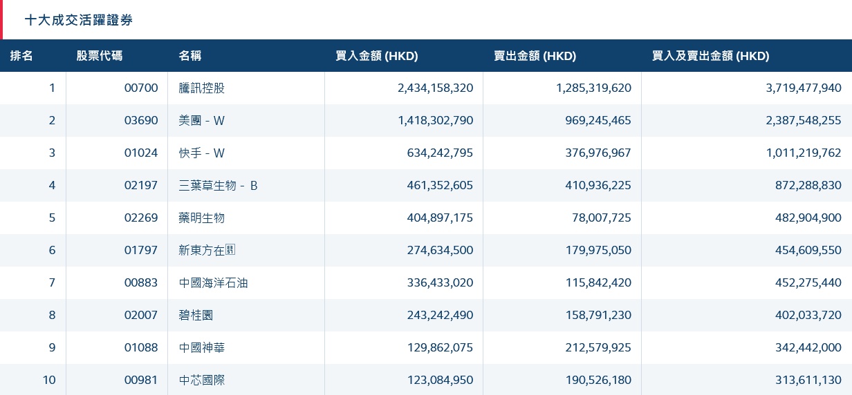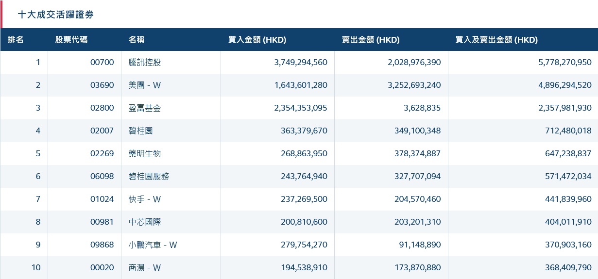 此外,盈富基金(02800)、小鹏汽车-W(09868)分别获净买入23.5亿、1.88亿港元。而碧桂园服务(06098)、中芯国际(00981)分别遭净卖出8394万、6983万港元。