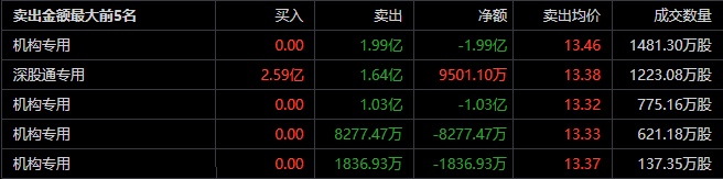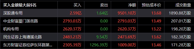 具体来看,今日上榜的营业部中,共有5家机构专用席位现身,即买三、卖一、卖三、卖四、卖五,合计净卖出3.78亿元,深股通为第一大买入营业部及第二大卖出营业部,买入金额为2.59亿元,卖出金额为1.64亿元,合计净买入9501.11万元。