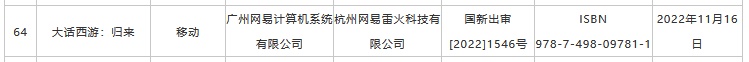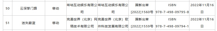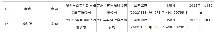 智通财经APP获悉,11月17日,国家新闻出版署公布2022年11月份国产网络游戏审批信息,共计70款游戏获批。在此次获批版号的游戏中,重点游戏包括网易(09999)的《大话西游:归来》、腾讯(00700)的《合金弹头:觉醒》、心动公司(02400)的《退休模拟器》、咪咕互娱的《云深掌门路》、吉比特(603444.SH)子公司雷霆网络的《捕梦猫》、中青宝(300052.SZ)的《藏武》、完美世界(002624.SZ)的《迷失蔚蓝》等。