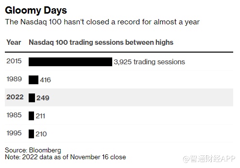 智通财经APP获悉,距离纳斯达克100指数上次收于历史高位已经过去差不多一年,但没有迹象表明该指数会很快回到这些高位。