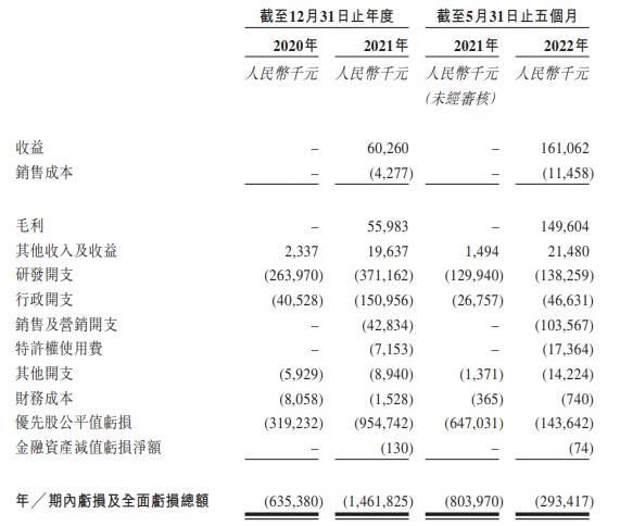 财务方面,于往绩记录期,公司概未盈利,并产生经营亏损,截至2020年及2021年12月31 日止年度以及截至2022年5月31日止五个月,经营亏损分别为人民币6.35亿元、人民币14.62亿元及人民币2.93亿元。公司的绝大部分经营亏损是由于研发开支、行政开支及优先股公平值亏损所致。