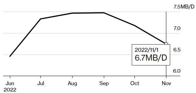 油轮运输公司Petro-LogisticsSA首席执行官丹尼尔格伯(Daniel Gerber)也表示,欧佩克+组织13个成员国的原油出口量“在11月上半月的下降幅度非常大,日降幅超100万桶”。
