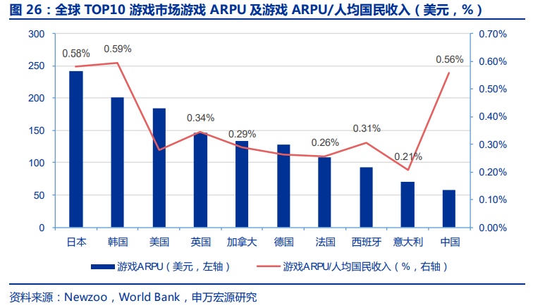 公开数据显示,中国游戏ARPU(含手游、端游、主机等整体)绝对值在全球TOP10国家中垫底,肉眼可见的差距预示着我国游戏行业付费水平的潜在增长空间仍然巨大,未来伴随着国内经济的持续发展、人均收入的提高,这一差距或许将收窄、消弭。