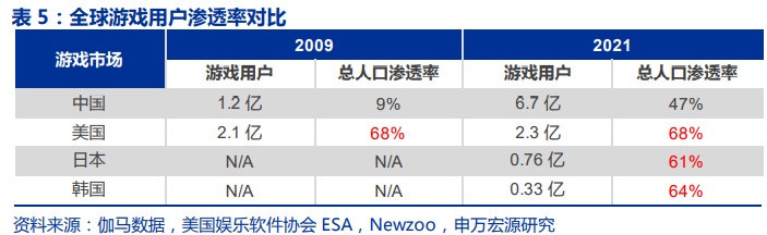 另外,我国游戏行业的用户渗透率或许亦未到顶。数据显示,我国游戏用户渗透率从2009年的9%提升至2021年的47%,但近年来这一数据显著放缓,这引发了市场对于用户数量到达天花板的担忧。但若横向对比美、日、韩等发达国家,实际上我国游戏用户的渗透率仍有进一步提升的空间。