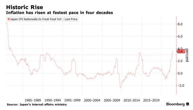 这一数字超出了分析师预期的3.5%,也是自1982年以来的最高水平。尽管结果不太可能说服日本央行行长黑田东彦改变方针政策方针,但物价涨幅已经连续七个月超过了日本央行2%的通胀目标。