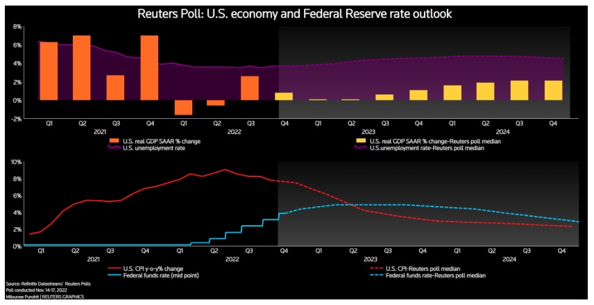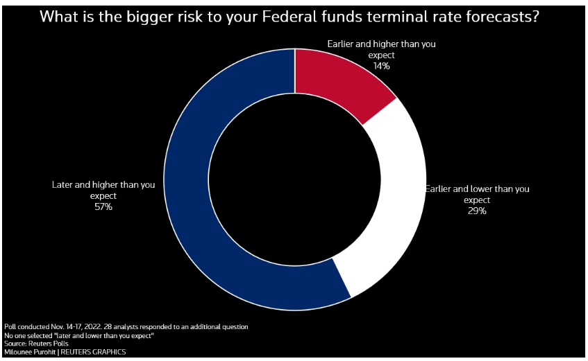 参加11月14日至17日调查的84位经济学家中,有78位认为,美联储将在12月会议上将联邦基金利率上调50个基点,至4.25%-4.50%的区间。