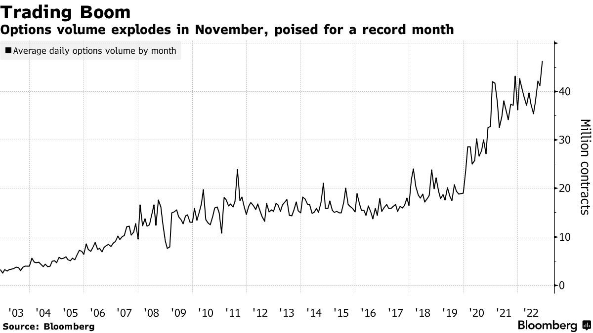 美联储激进加息,和美联储官员“时而鹰,时而鸽”的言论引发的市场波动,正鼓励投资者在期权上全力以赴,一些投资者同时押下看涨和看跌的赌注,寻求对冲风险。统计数据显示,11月每天约有4600万份期权合约被易手,有望成为有记录以来期权交易最繁忙的一个月,交易量比上个月上涨了12%。