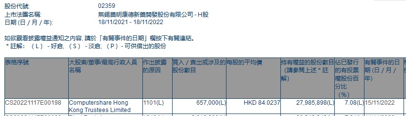 智通财经APP获悉,香港联交所最新资料显示,11月15日,Computershare Hong Kong Trustees Limited增持药明康德(02359)65.70万股,每股作价84.0237港元,总金额约为5520.36万港元。增持后最新持股数目约为2798.59股,最新持股比例为7.08%。