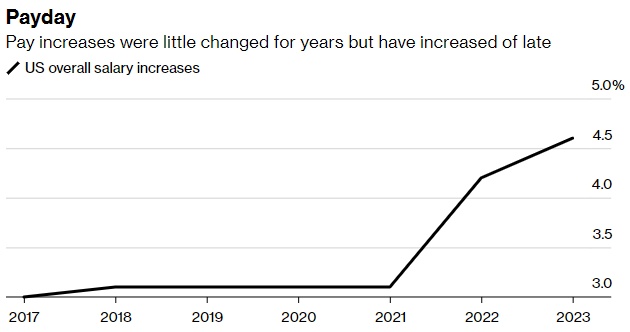 今年早些时候进行的一项类似的WTW调查仅显示,2023年美国整体工资预计将增长4.1%。在过去一年中,七成公司在薪酬调整方面的支出超过了计划,并且原本罕见的年中加薪现象变得司空见惯,一些公司正在通过涨价或减少员工总数来应对涨薪的情况。