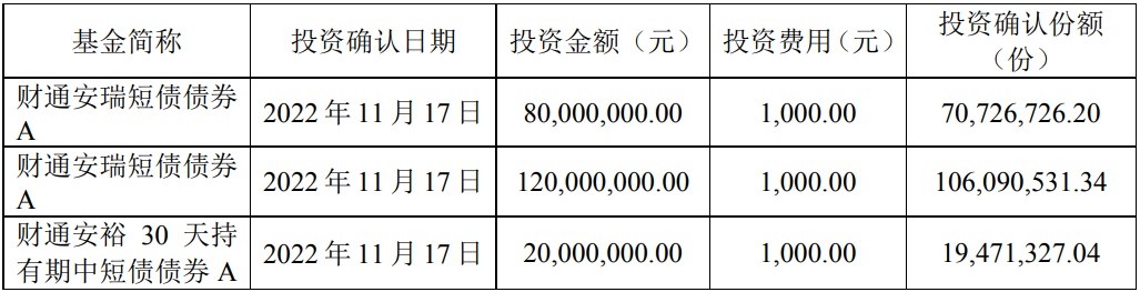 其中,财通安瑞短债债券A投资2亿元,财通安裕30天持有期中短债债券A投资0.2亿元。
