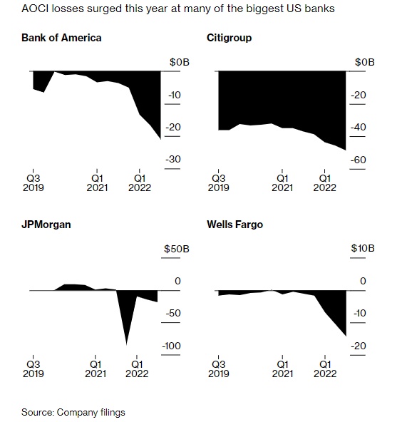 未实现亏损不会出现在公司的利润表中,但根据会计规则,它们最终仍会打击银行的资产负债表,影响累计其他综合收益(AOCI)。富国银行等美国四大银行报告称,它们第三季度的AOCI下降160亿美元至负1020亿美元。由于AOCI的波动会影响股东权益,因此AOCI的下降对关键资本比率造成了压力。