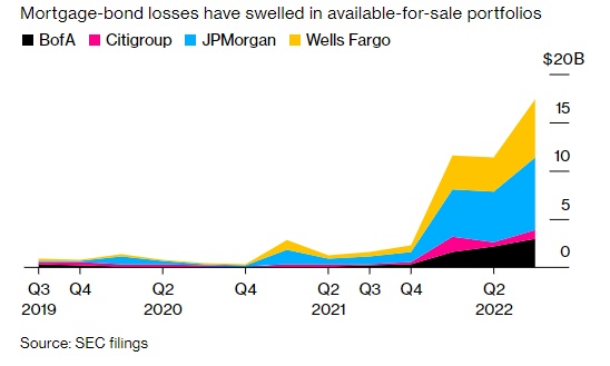 智通财经APP获悉,美国利率持续上升提振了该国大型银行的营收,但也导致这些银行在短期内也不得不减记资产负债表上的资产价值,加剧资本挤压并促使它们中的大多数停止回购股票。以富国银行(WFC.US)为例,更高的利率帮助该行在第三季度实现了超过30亿美元的利润,不过在抵押贷款支持证券和其他债券上出现了高达24亿美元的未实现亏损。富国银行的三大竞争对手摩根大通、花旗、美银也遭受了类似的打击。数据显示,仅在抵押贷款支持证券方面,这四家银行的未实现亏损已攀升至170亿美元。