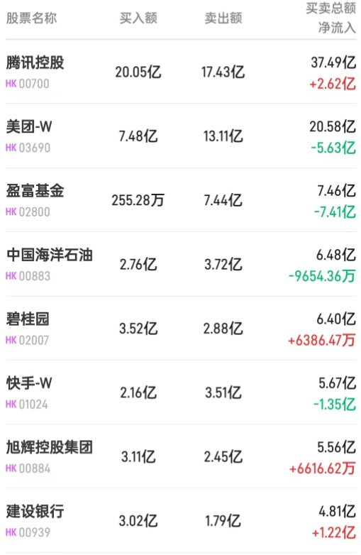 北水净买入最多的个股是腾讯(00700)、快手-W(01024)、中海油(00883)。北水净卖出最多的个股是盈富基金(02800)、恒生中国企业(02828)。