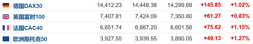 2. 截至发稿,德国DAX指数涨1.02%,英国富时100指数涨0.83%,法国CAC40指数涨1.15%,欧洲斯托克50指数涨1.27%。