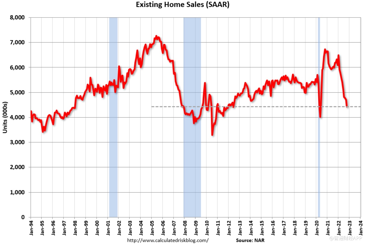 智通财经APP获悉,全美房地产经纪人协会(NAR)的数据显示,10月份的成屋销售较9月份下降了5.9%,经季节性调整后的年率为443万套,同比下降28.4%。如不计入2020年5月新冠疫情刚开始时出现的销售急剧放缓,现在的销售速度是自2011年12月以来最慢的。