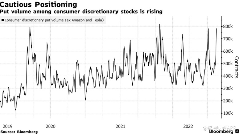 非必需消费品行业看跌期权的成交量最近飙升,目前的成交量与2020年3月疫情抛售期间的水平类似。5月份许多零售商下调了年度利润预期,也引发了投资者的质疑。