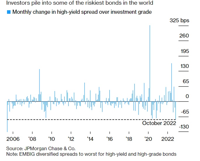 在本月之前,自2008年金融危机以来新兴市场债市出现了最残酷的抛售。新兴市场的基金经理们认为,高收益债券非常便宜以及它们相对于较高评级债券的表现不佳是一种不可持续的扭曲。但由于美联储激进的货币紧缩政策推动美债收益率飙升,这些新兴市场债券此前一直无人问津。直到现在,随着未来的加息步伐可能放缓,投资者才回归到这些债券。