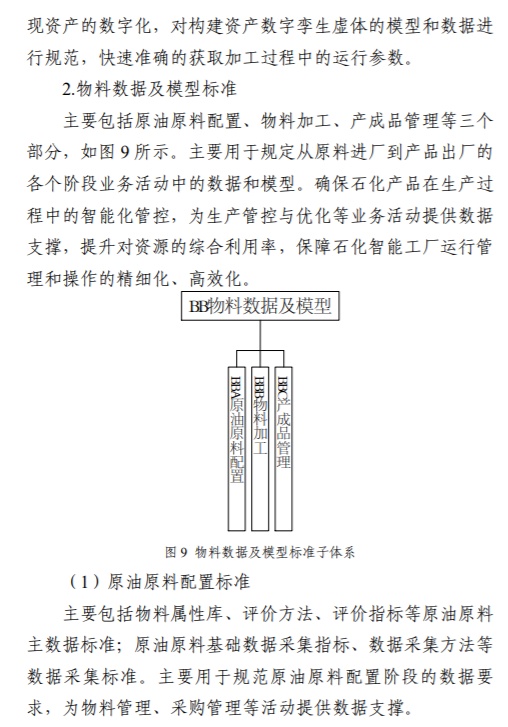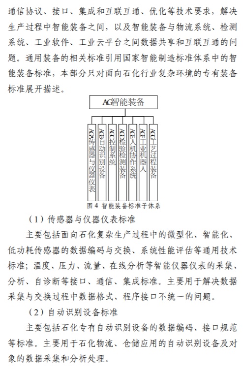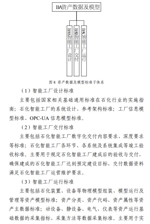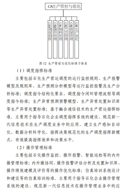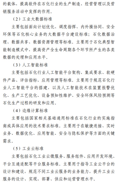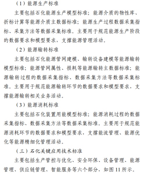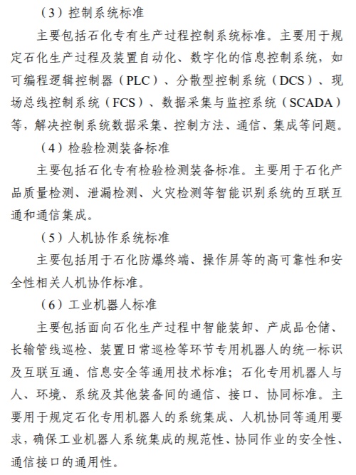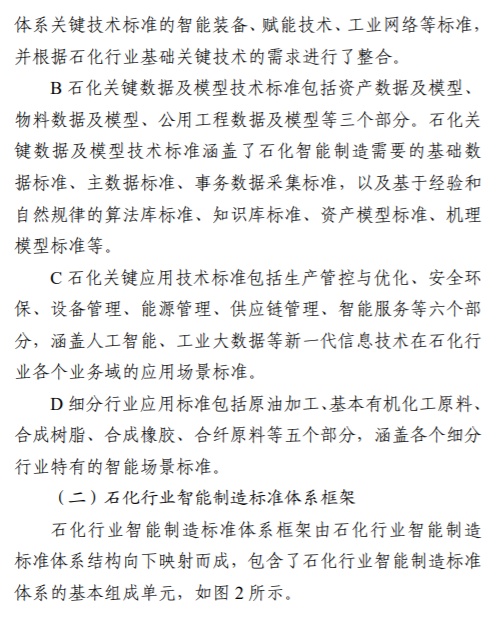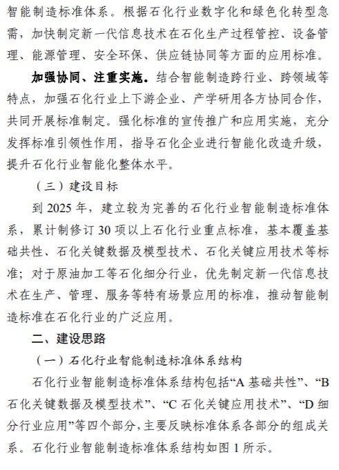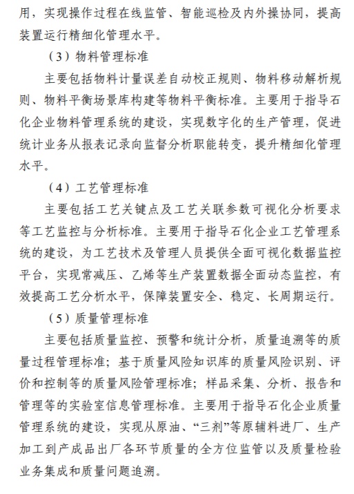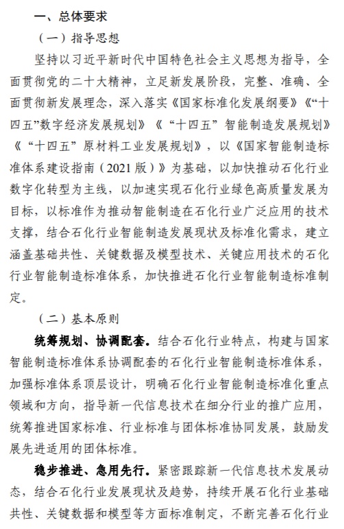 其中提到,统筹规划、协调配套。结合石化行业特点,构建与国家智能制造标准体系协调配套的石化行业智能制造标准体系,加强标准体系顶层设计,明确石化行业智能制造标准化重点领域和方向,指导新一代信息技术在细分行业的推广应用,统筹推进国家标准、行业标准与团体标准协同发展,鼓励发展先进适用的团体标准。稳步推进、急用先行。紧密跟踪新一代信息技术发展动态,结合石化行业发展现状及趋势,持续开展石化行业基础共性、关键数据和模型等方面标准制定,不断完善石化行业智能制造标准体系。根据石化行业数字化和绿色化转型急需,加快制定新一代信息技术在石化生产过程管控、设备管理、能源管理、安全环保、供应链协同等方面的应用标准。