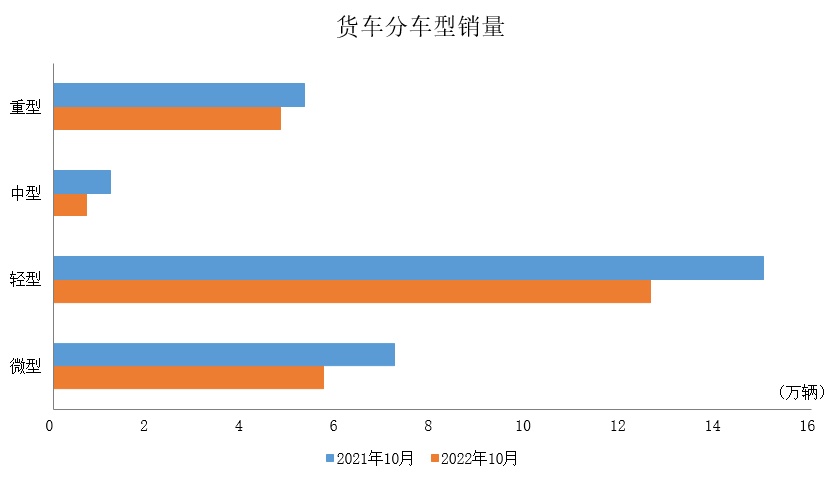 2022年10月,与上月相比,货车产量微增、销量微降;与上年同期相比,货车产销均呈明显下降。在货车细分品种中,与上月相比,重型货车和轻型货车产销呈不同程度下降,中型货车产量明显下降、销量微增,微型货车产销呈两位数增长;与上年同期相比,四大类货车品种产销均呈不同程度下降。