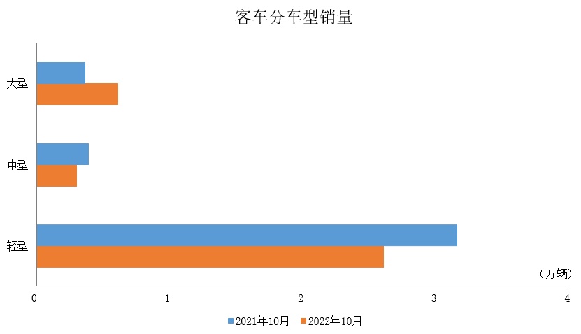 2022年10月,与上月相比,客车产销均呈下降;与上年同期相比,客车产量小幅增长、销量小幅下降。在客车细分品种中,与上月相比,大型客车产销实现增长,中型客车和轻型客车产销呈不同程度下降;与上年同期相比,大型客车产销呈现较快增长,轻型客车产量小幅增长、销量呈两位数下降,中型客车产销均下降。