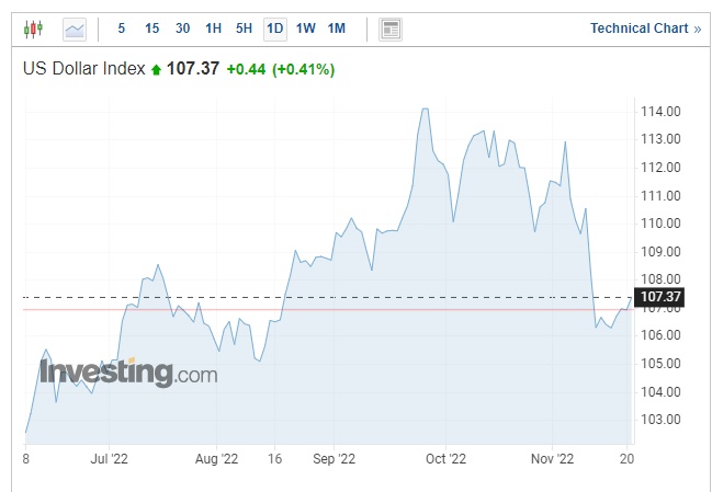 美元指数自9月的峰值下跌了5%以上,截至发稿,该指数上涨0.41,报107.37。