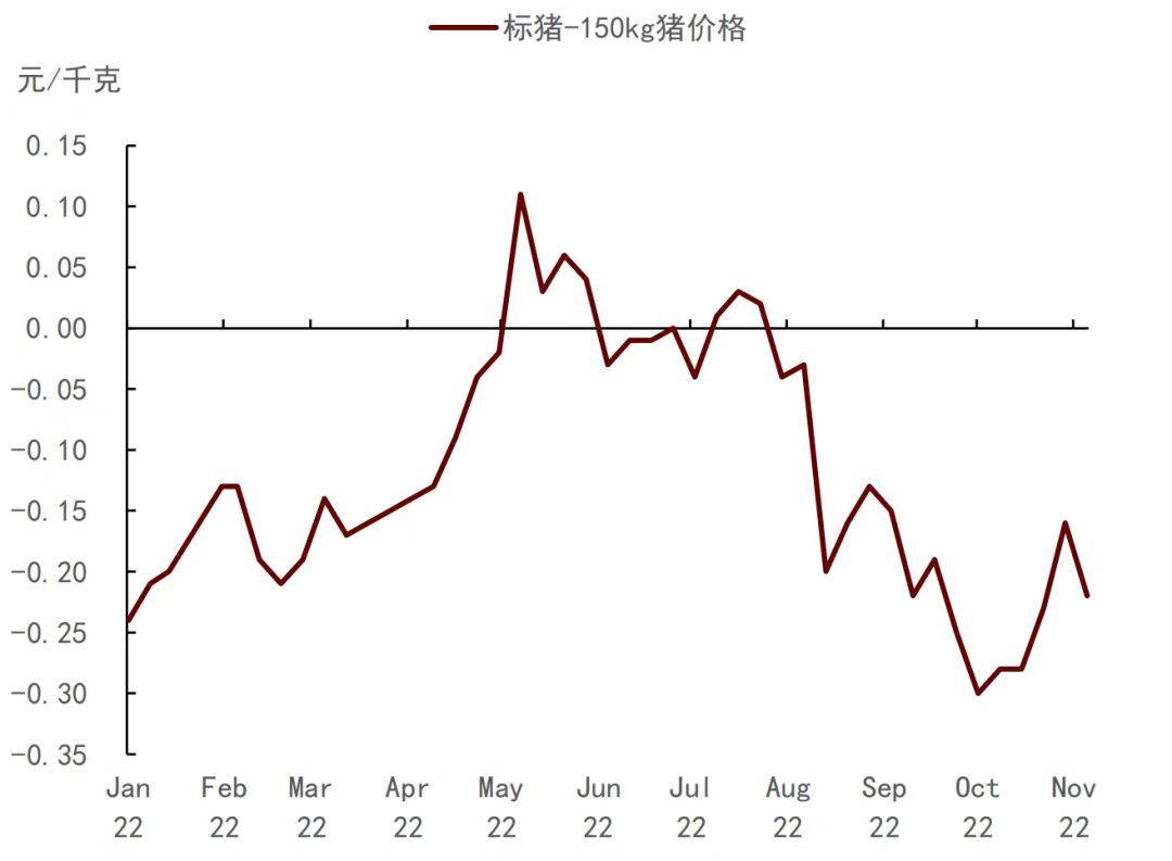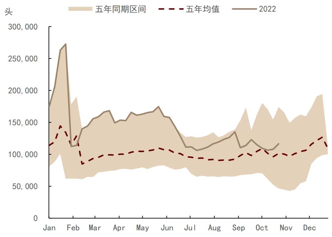 供给压力将继续释放。需要明确的是,从大周期来看,11-12月我国生猪总体的出栏量仍是在下滑趋势内。2022年1-3月份能繁母猪存栏环比分别为-0.9%、-0.5%、-3.30%,根据10个月的生长周期推算,12月份生猪理论出栏量也将下行。但是由于压栏与二次育肥导致供给后置,可以抵消掉趋势性下行减量。具体来看,一方面从压栏情况来看,据涌益咨询数据,11月企业计划出栏量环比增加5.16%,对比9、10月份环比数据为-3.7%和-1.40%。同时, 9、10月份80KG以上大猪(按照育肥出栏约2-3个月计算)月度存栏量环比增幅分别为1.11%和3.46%,对比7、8月份明显增加,基于以上数据,我们预计11月压栏将逐步缓解,出栏量将顺势增加。从二次育肥的情况来看(二次育肥是指将已出栏的90-110公斤猪源进行再次回圈增重育肥),由于出栏体重的提高,猪肉供应增量也将有所增加。据卓创资讯监测数据,7-9月生猪宰后均重在91.11KG,进入11月体重快速上升至94.36KG,增幅达到3.57%,我们预计随着二次育肥猪源增量出栏,宰后均重增幅或继续扩大,补充后市猪肉供应。据卓创资讯调研显示,今年7-10月份二次育肥比例约在20%-30%。综合对比分析,我们预计11-12月,我国生猪有效供给将呈现增加趋势,平均增幅或在5-8%左右。
