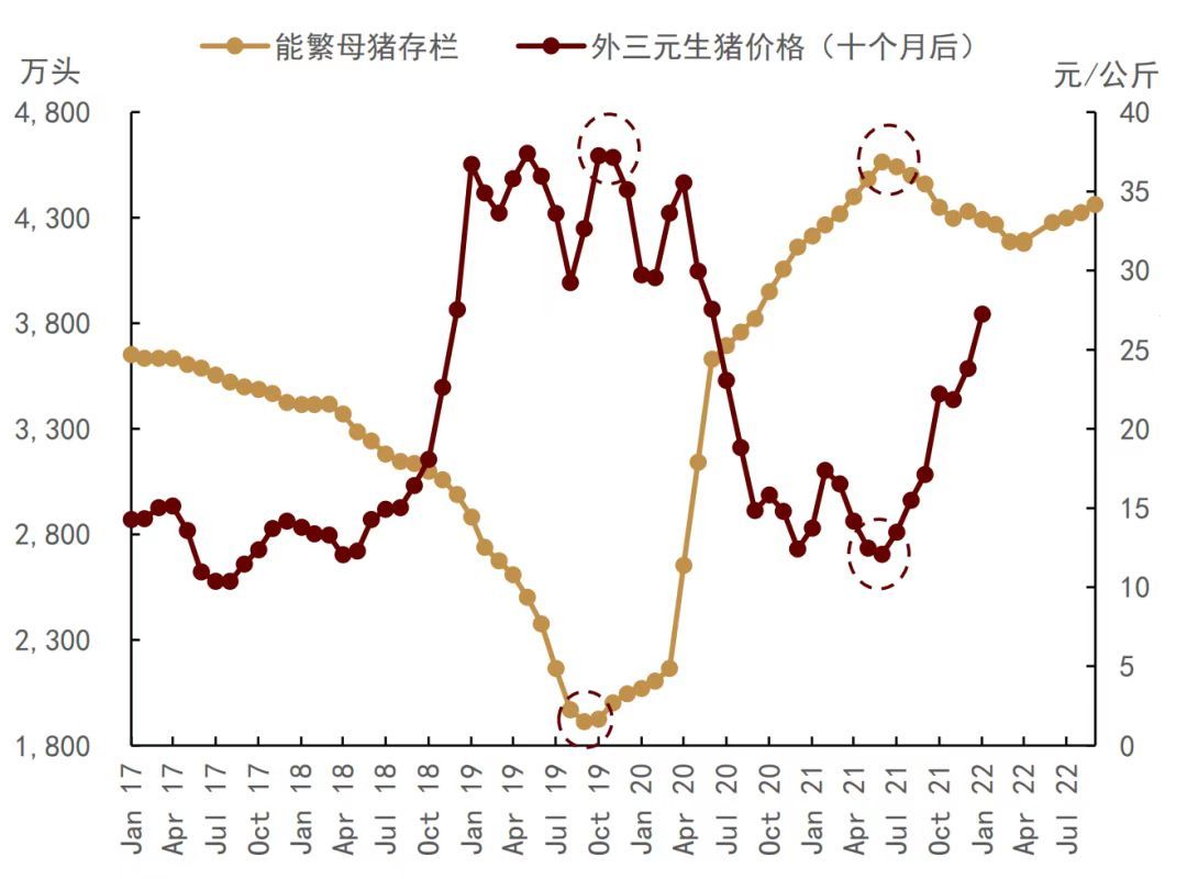对于新一轮猪周期,我们认为或呈现三点特征。一是政策规定了产能合理区间后,能繁母猪存栏与生猪价格波动区间或小于前几次周期;