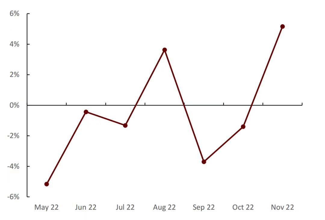 10月底以来,节日效应逐步消散,终端消费回归清淡,同时我们看到疫情有所反复,南方消费不及预期,肥猪消化缓慢,标肥价差有所收窄。据涌益咨询数据,截至11月10日当周,175KG、200KG大体重猪与 120KG标猪价差分别为 0.56元/斤、0.64元/斤,较高点分别回落0.14元/斤、0.13元/斤。另外,局部疫情反复之下,特别是广州、成都、郑州等主销区,疫情导致外出就餐、高校集中采购等消费行为明显下降。尽管餐饮旺季之下环比有所改善,但根据国家统计局数据,十月我国社零餐饮收入同比下滑8.1%。