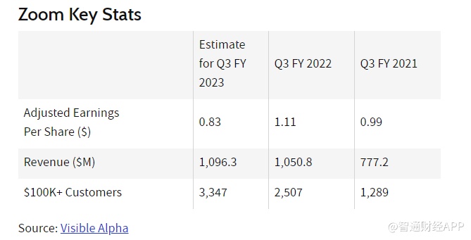 智通财经APP获悉,Zoom视频通讯(ZM.US)将于美东时间11月21日美股盘后(北京时间11月22日清晨)公布2023财年第三季度业绩。市场预期,该公司Q3营收为10.96亿美元,上年同期为10.51亿美元;调整后每股收益为0.83美元,上年同期为1.11美元。